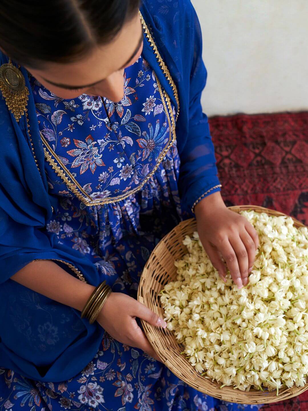 - The blue georgette floral printed kurta palazzo set with dupatta is a stunning piece of ethnic wear by Janasya designed for festive occasions. Crafted from georgette fabric the kurta features a mandarin collar, giving it a stylish and traditional look. The yoke and sleeve hem of the kurta are embellished with exquisite gota work, adding intricate detailing and enhancing its overall appeal. The set includes a matching palazzo that complements the kurta perfectly. Complete the style with a solid blue chiffon dupatta and add minimal accessories that adds a graceful touch.