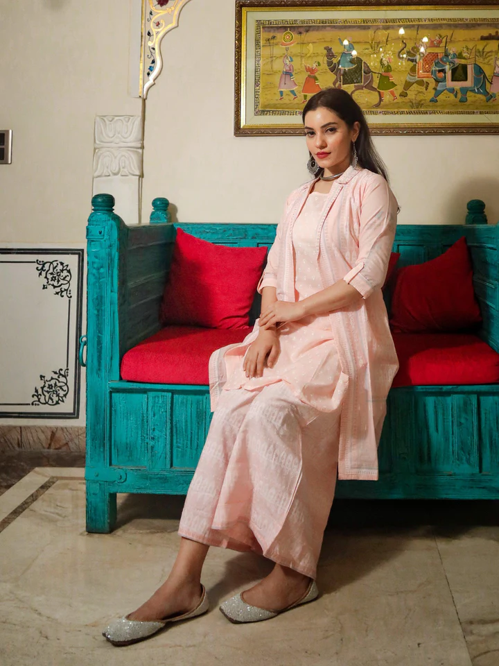 For A True Fashionista Divena Presents Baby Pink Three Piece Set With Flared Palazzo And A Jacket. It Has Intricate Sequin Work Over The Jacket And Modern Print Makes It Unique. The Three Layered Piece Has Sleeveless Kurti Inside. Team It With A Watch And Minimal Accessory. Best for Casual as Well As Formal Occasion.