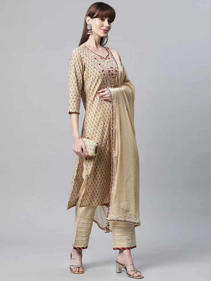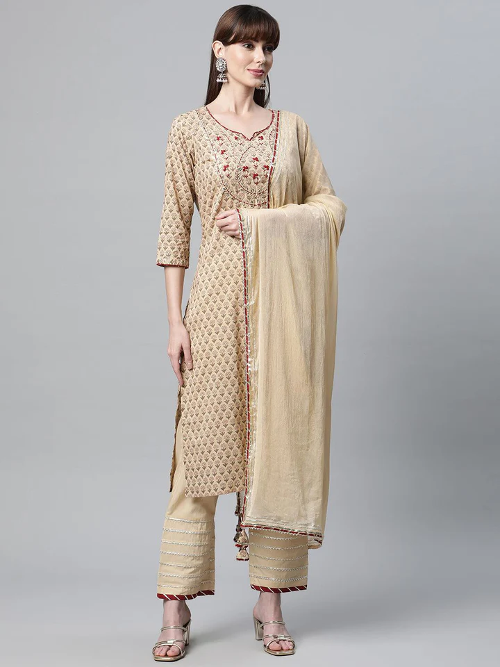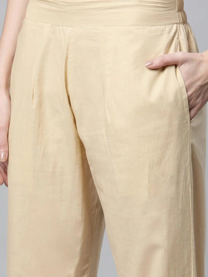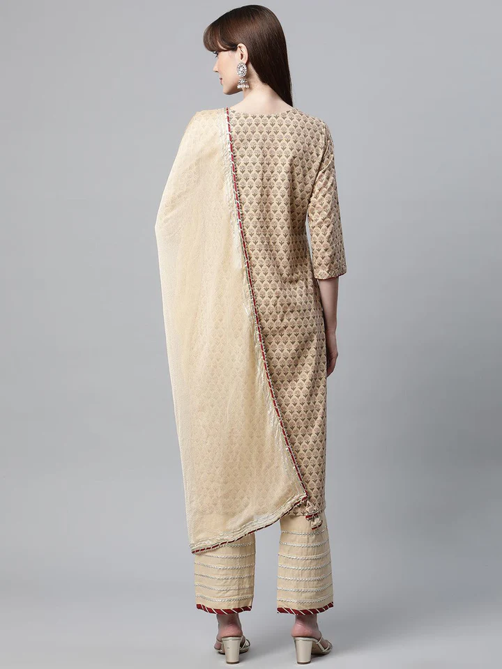 Divena Beige Color Cotton Straight Kurta Pant Set with Dupatta