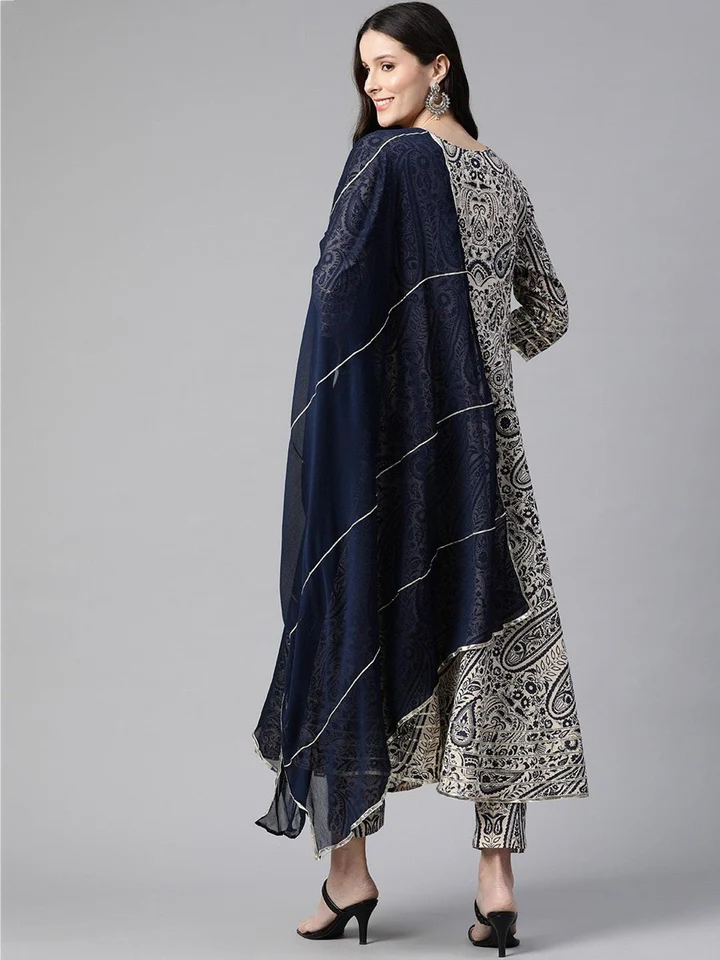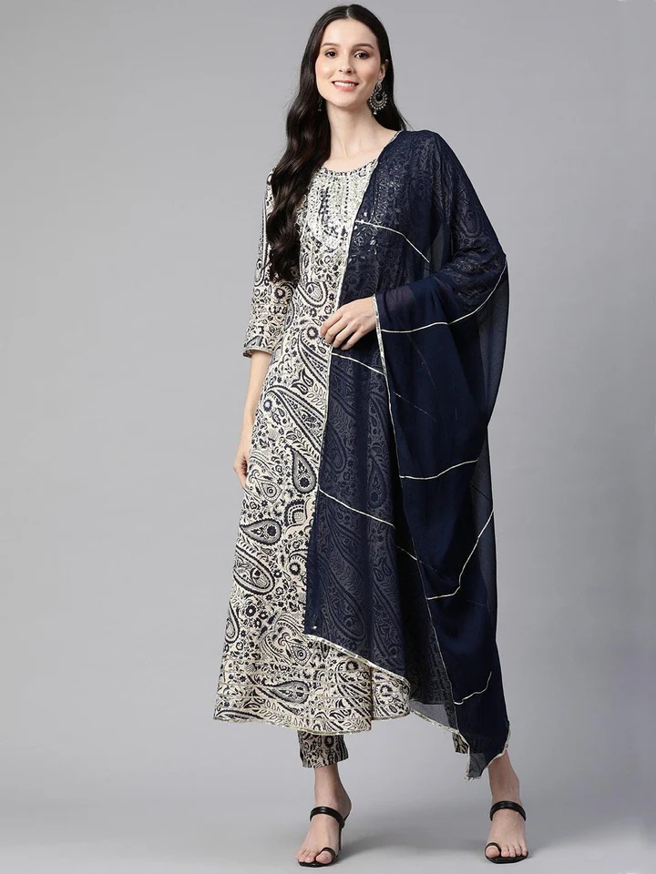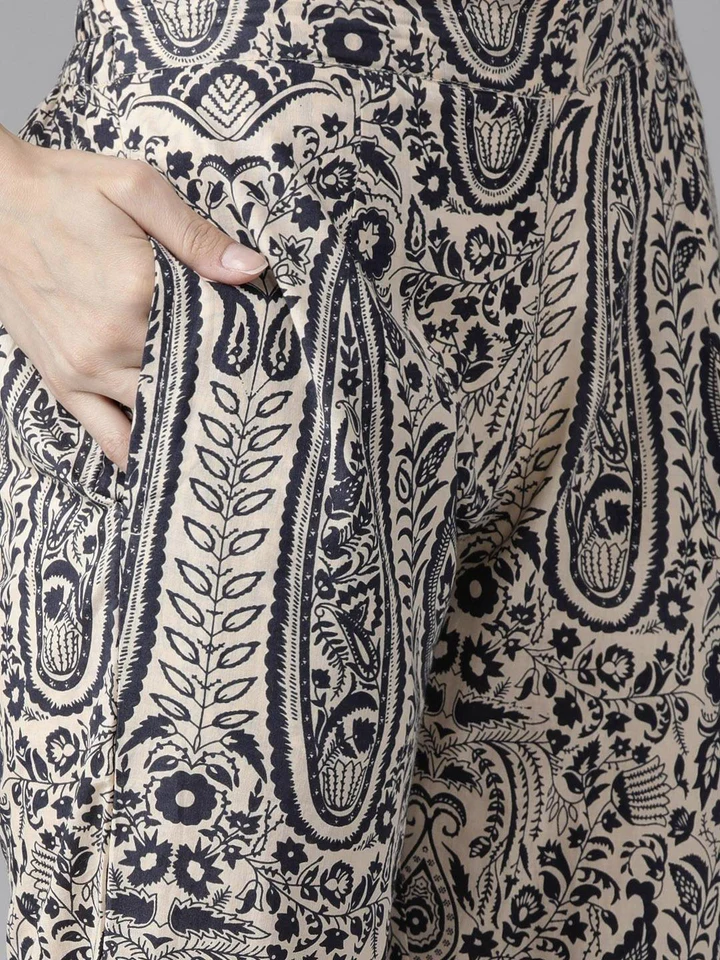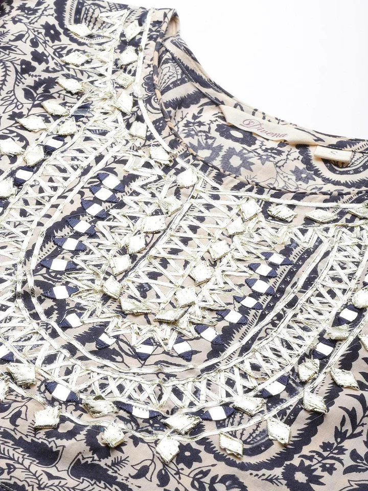 It Is Extremely Feminine And Stylish, This Exclusive Piece OfHas Everything You Have Been Looking For, Style Comfort And Unique Pattern. The Vibrant Beige and Black Color Adds up To the Feminine Beauty, it has Printed Pant and its has round neck covered with Heavy gota patti work Front Botton. It perfect casual & Festive Look.