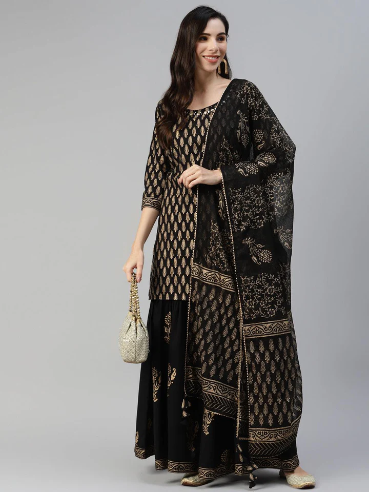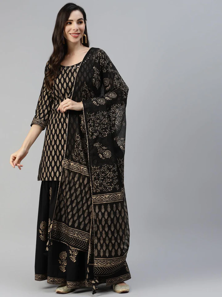 Divena Black Gold Printed Cotton Kurta Sharara Set with Dupatta