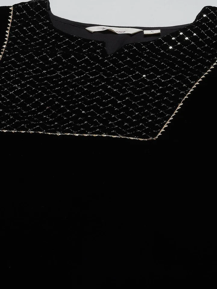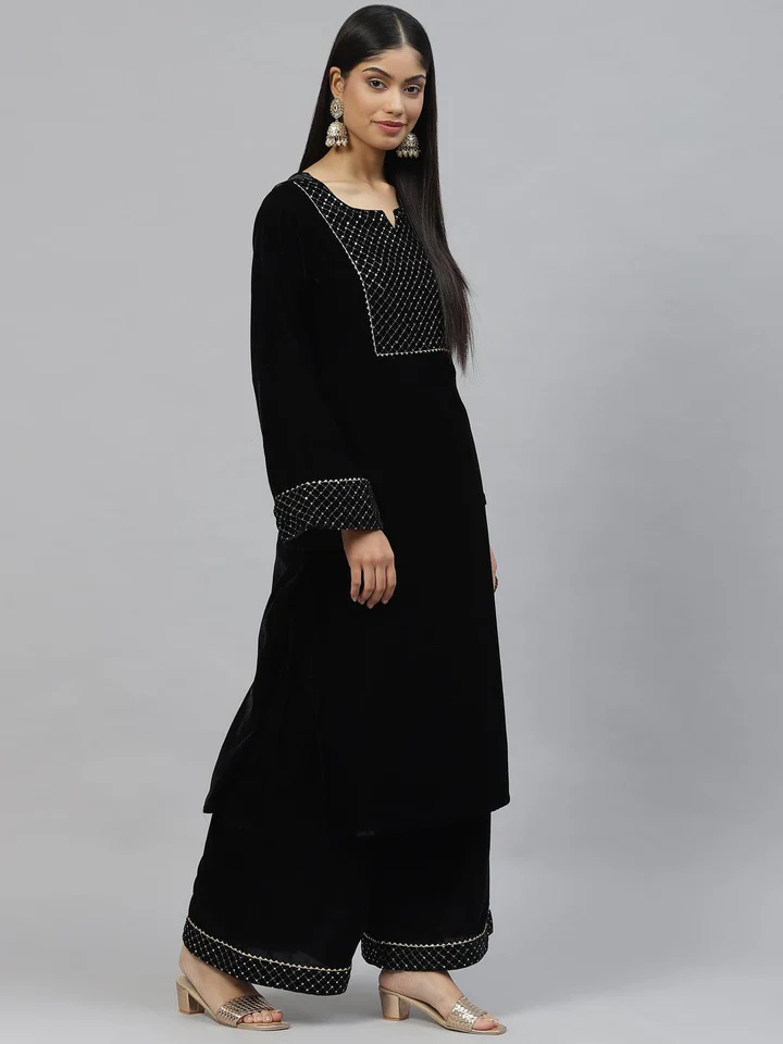 Look Ethereal in Divena Black Velvet hand work Kurta pant With Net Dupatta set for winter season. The fabric is soft, fine in quality, skin friendly and warm. it has Black warm velvet fabric for Kurta and bottoms.it has round neck of kurta with Sequined work yoke design with pant and Net Dupatta. It useful to wedding session and small function. pair it with white valley to stylish look.