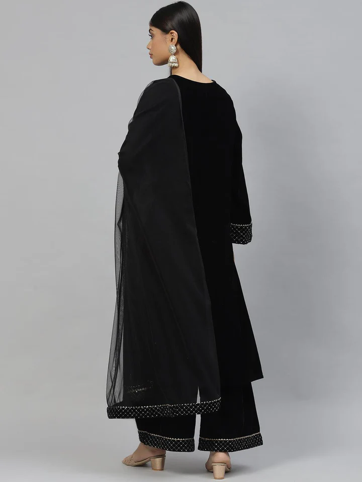 Divena Black Velvet hand work Kurta pant With Net Dupatta set