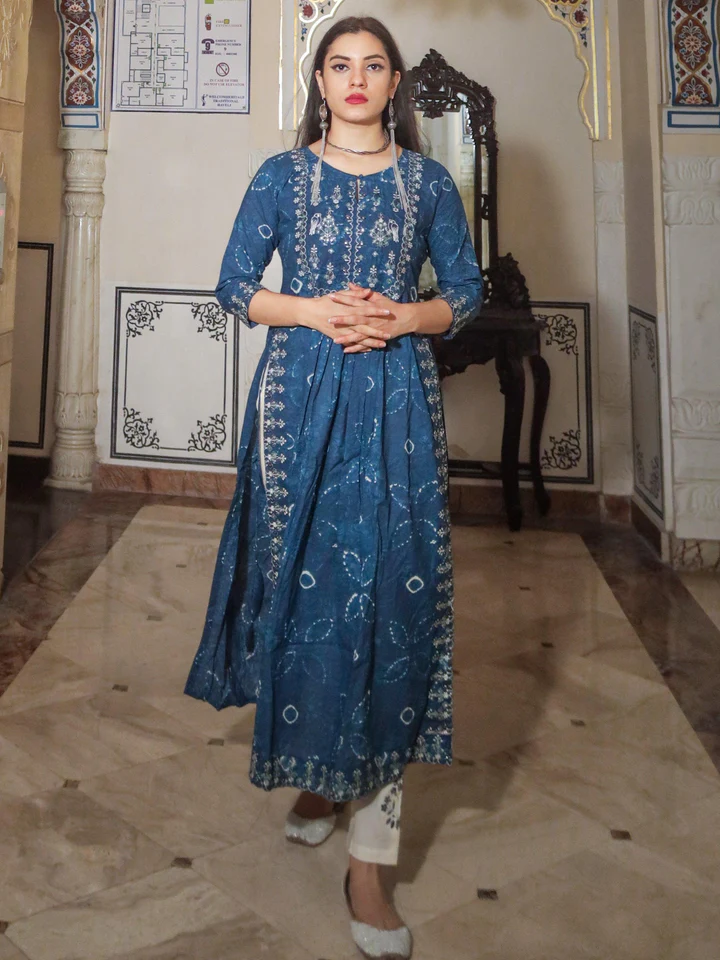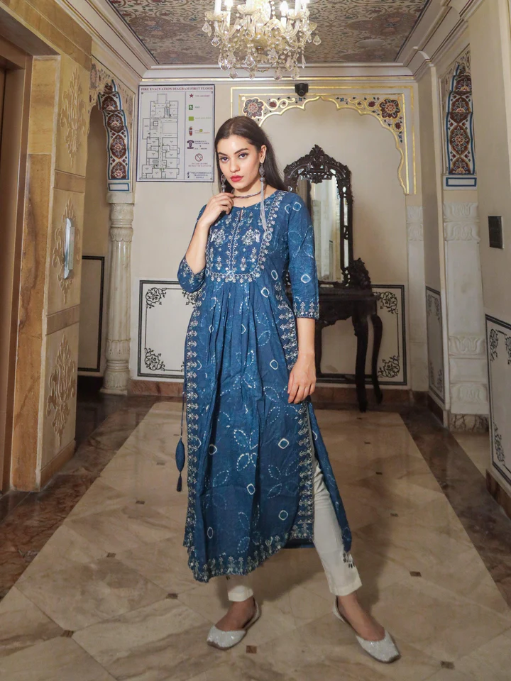Totally In Awe Of This Stunning Blue Printed Kurti Palazzo, What More We Can Say Then Just To Stare At It, You Can Grab This Stunning Piece Too, It Has Beautiful Intricate Sequin Work In Front Neck And Back And Appealing Straight Pattern, With Buti Motif All Over And A Flared Palazzo To Compliment The Whole Look, Just Accessorize It Minimally And You Are Ready To Shine.