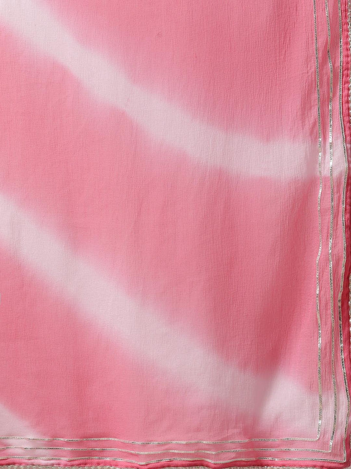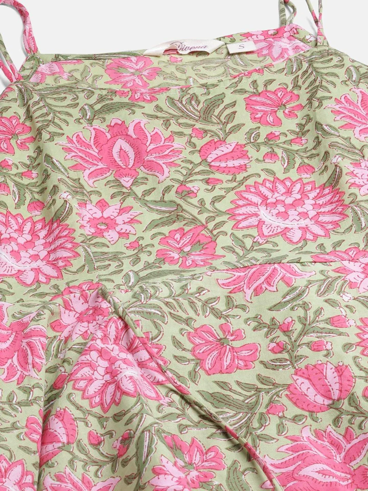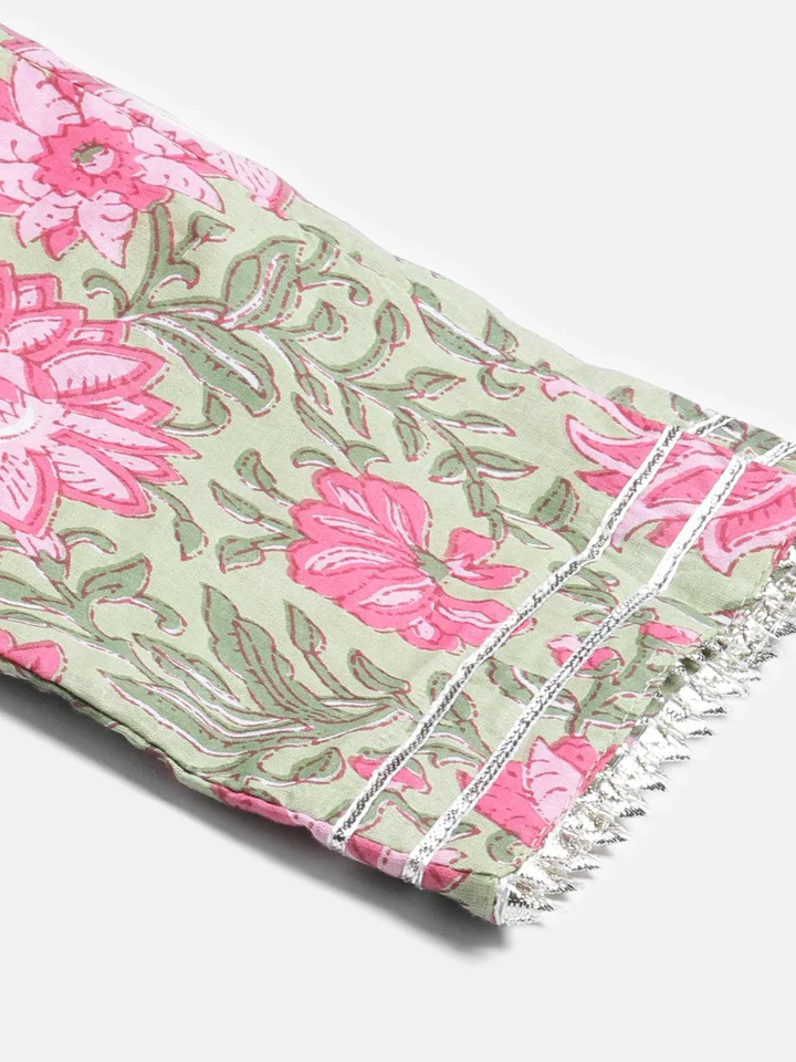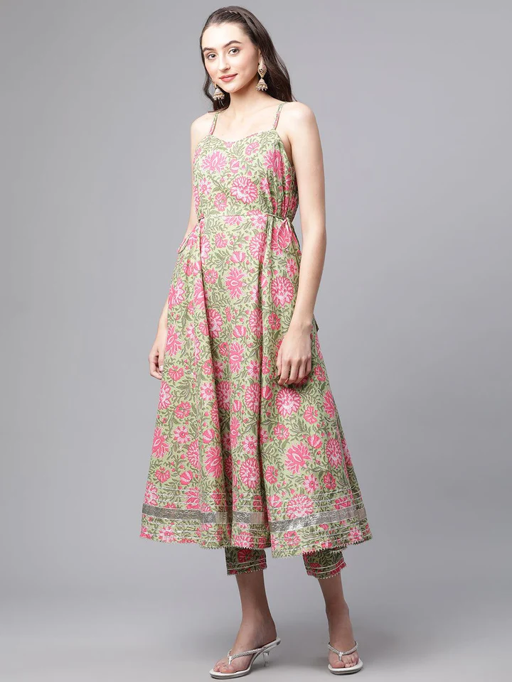 Swirl around in Your Best Moves with Divena Green Floral Printed Anarkali Kurta Pant Set with Dupatta With Chiffon Dupatta, it has round neck with shoulder strips with printed cotton Pant You Can Wear It As A Western Dress And Even As Ethnic with tie and dye pink chiffon Dupatta Cover with Gota Patti lace also cover Bottom of Anarkali Kurta.