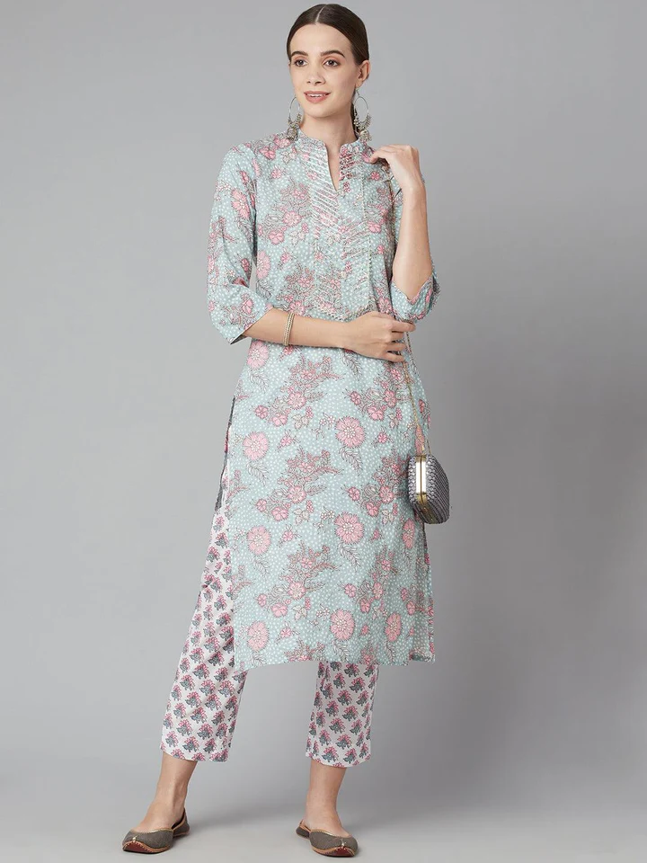 Pastel Colors Never Fail to Make an Impression, And Our Shades of Sku blue Set Is Just the Perfect One. The It Has Gota work on front Round neck along With the Floral Printed Pant with Side Pocket, Just makes it Perfect set For Any Outing.