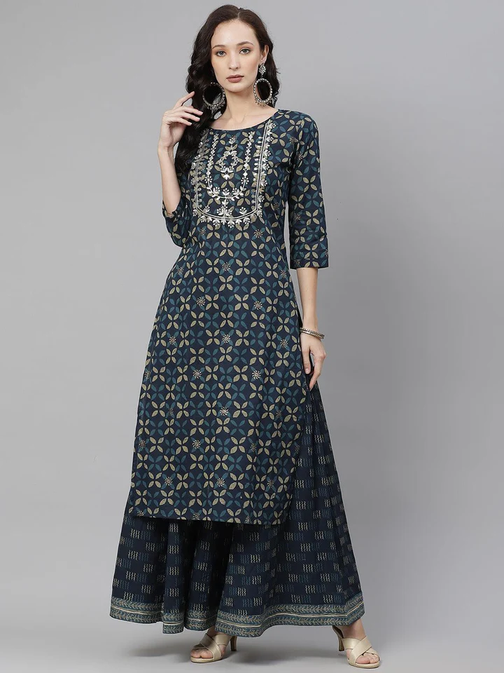 Become The Ultimate Style Icon With Indigo blue Kurta Set With Palazzo.Beautiful Detailed Threadwork Is Given On The Front Neck, With Flaired Palazzo With Gota Work All OverThe Border. Make Less It Wearable For All the Formal and Informal Occasions.