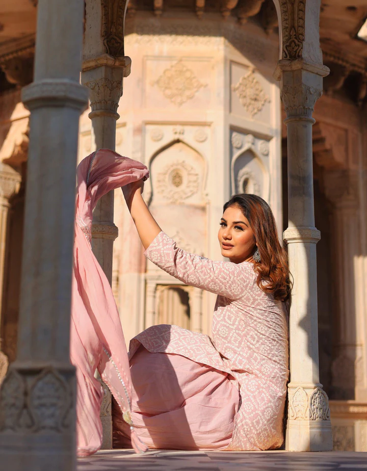 Indulge in the Self Love with This Light Pink Bandhani Printed Cotton Straight Kurta, Its Round neckline Covered with Gota patti work with back side tassels nad solid dupatta which is covered by border of gota patti lace and its palazzo also.
