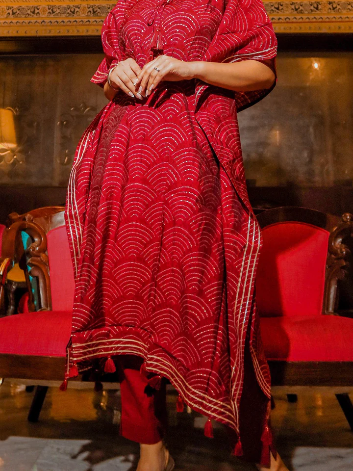 Exclusive Set of Maroon Rayon Bandhej Kaftan Pant Set. it’s Key Hole neck with String Design and sequined work on large placement of all kaftan. It’s gota patti with tussels of threads bottom Border and sleeves Border. This kaftan with Mahoon Solid Cotton Flex pant to finish look. it has two pocket. It’s very Stylish, comfortable and best suited for any traditional wear.