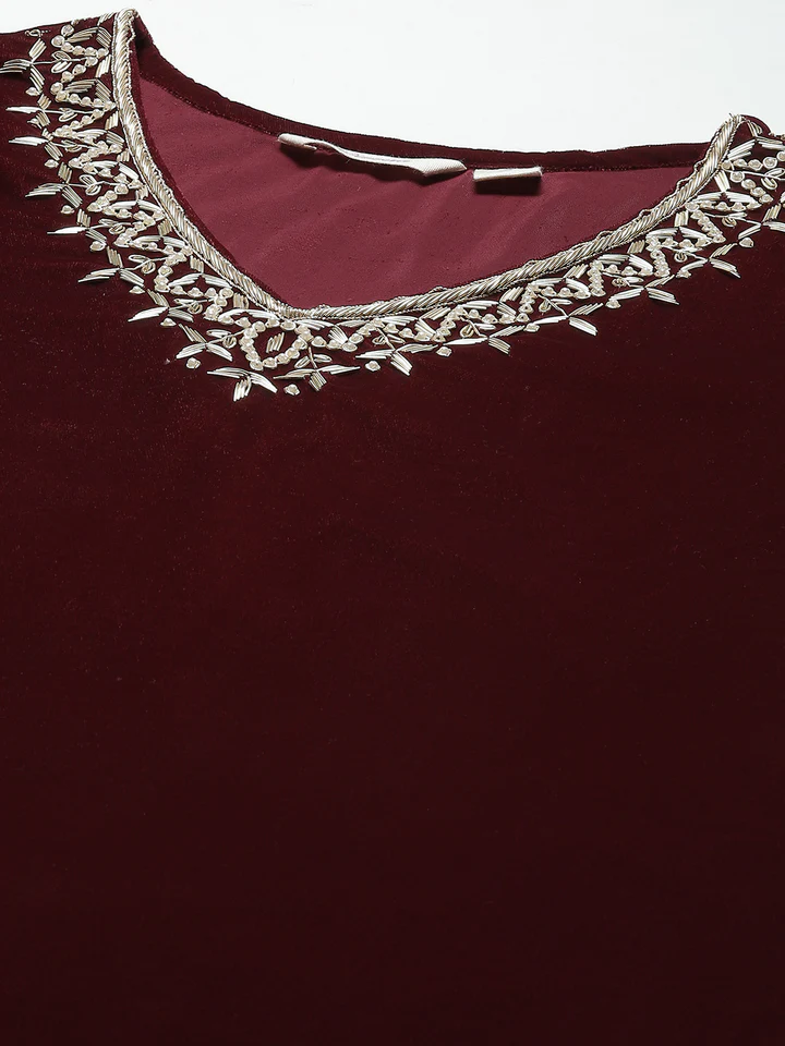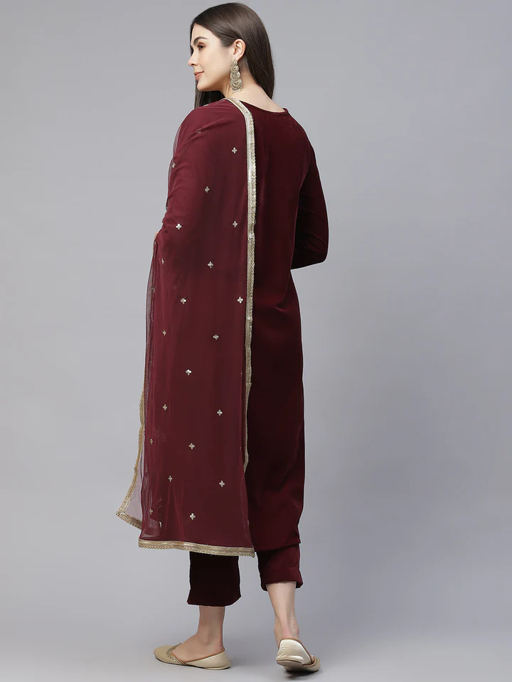 Be the first to review “Divena Maroon Velvet hand work Kurta pant With Net Dupatta set”