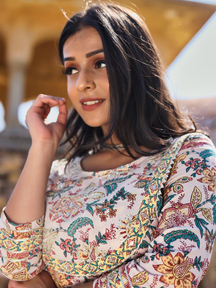 Divena Off white Cotton Anarkali Kurta Pant Set