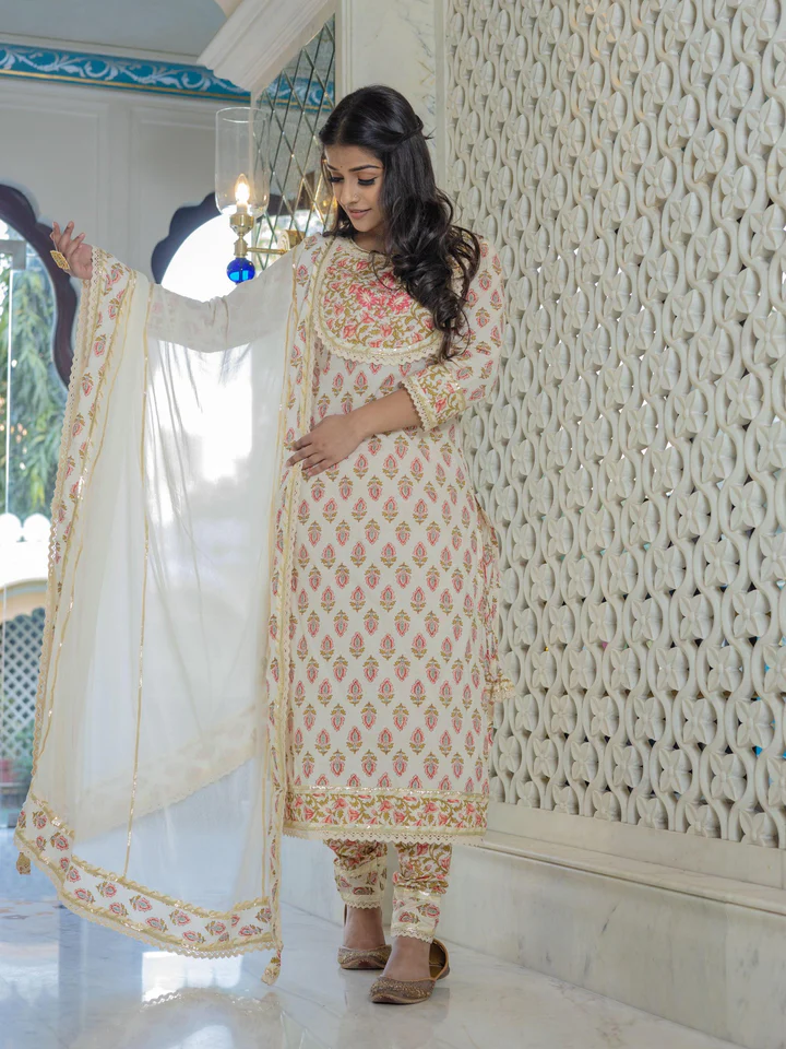 Feel the freshness of this Cream self-print cotton kurta with pant set with dupatta , it has Round neck with the covered with gota patti work And Coratia lace also covered bottom of Pant in self-print. Dupatta corner are coved with Coratia lace it looking gorgeous for that exclusive look or just go simple and stunning, keeping the look as it is. Mix and match with your favorite colors and you will always look like and ethereal diva in this white beauty.