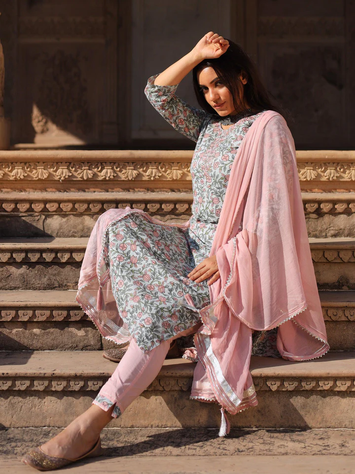 Divena Pastel Blue Floral straight Cotton Kurta Pant set with Dupatta