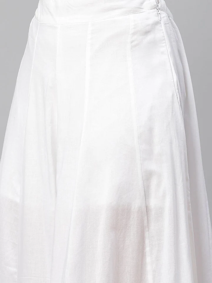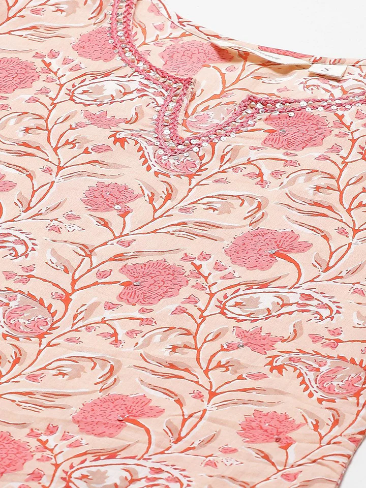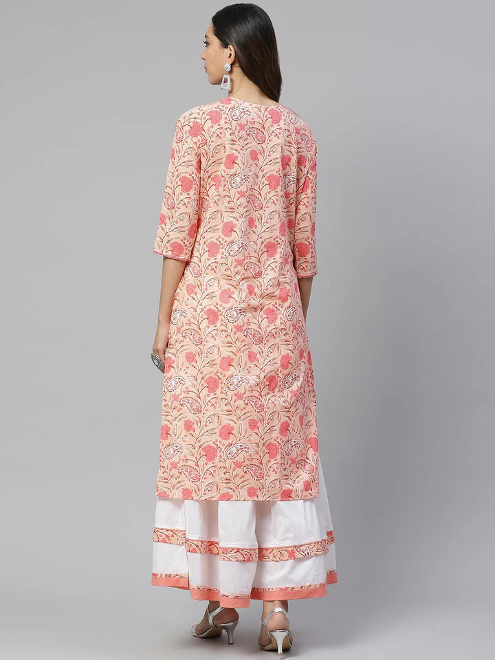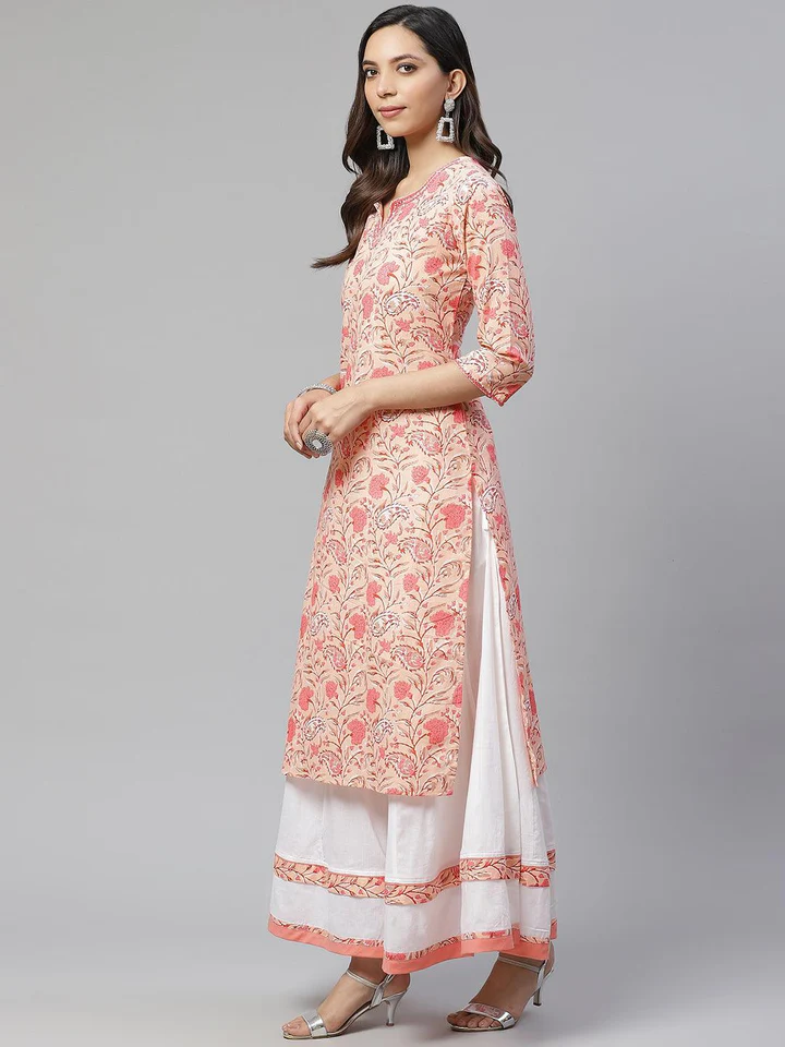 Stay Effortlessly Pretty In Our Breezy Cotton Peach Kurta And Palazzo Set, It Has Beautiful Embroidery Work On The Neckline And Suntle Print Jalwork All Over With White Cotton Palazzo Makes It Wearable For Daily Purpose Or Formal Meeting.