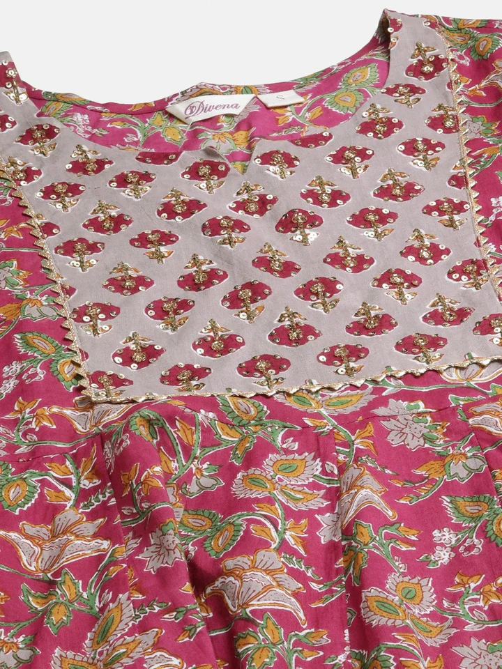 Keeping in Mind Need of Today’s World for Perfect Style, Elegance and Comfort. This purple floral printed Cotton Anarkali kurta Pant Set is perfect choice for you when you want to peaceful theme.it has round neck and sequinedon front neckline and bottom of this anarkali kurta. Best for Formal look