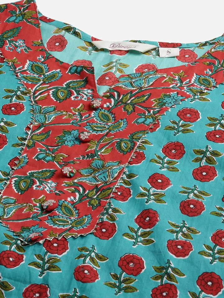 Divena Has the Ultimate Guide for Feminine Trendy Ethnic Wear, To Begin with You Can Choose This Very Sophisticated Piece from Divena, Which Is Rama Green in Color, Straight Kurti Patch work on front neck and Red Cotton Slim Fit Pants to Add the Grace and Complete Look, It Has Round with Sequine work, Best for Day Outing in A Summer Day and Even Evening Outing and Casual Wear.