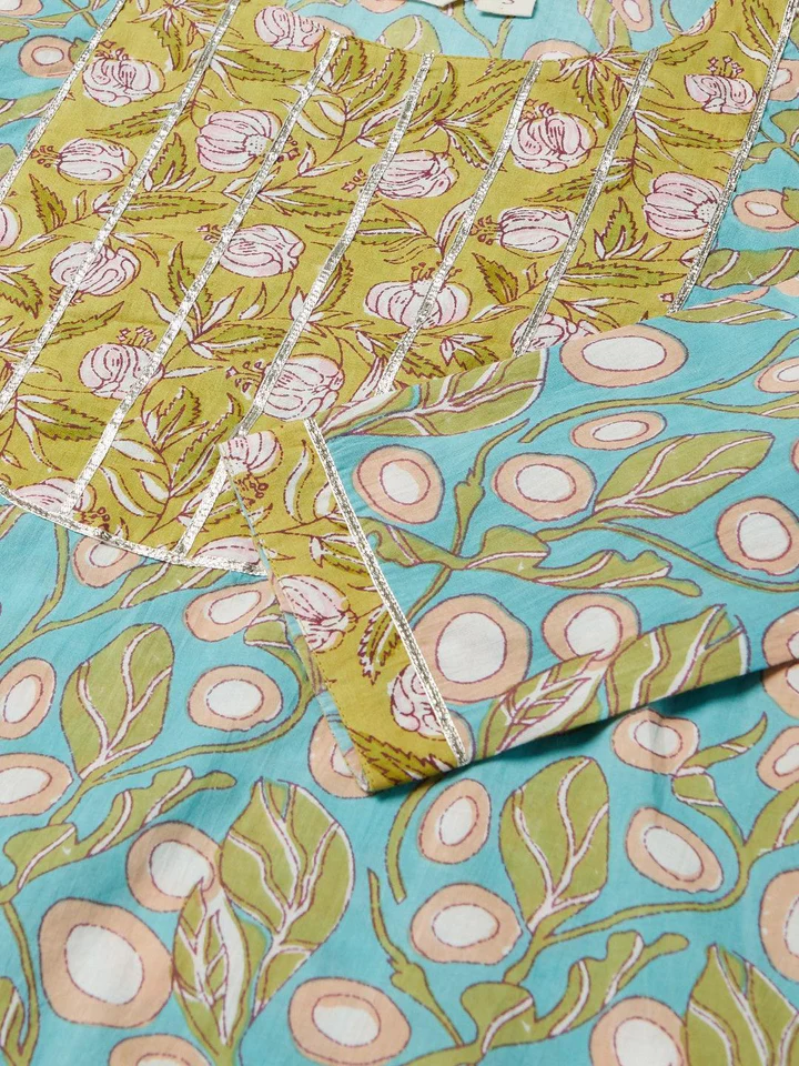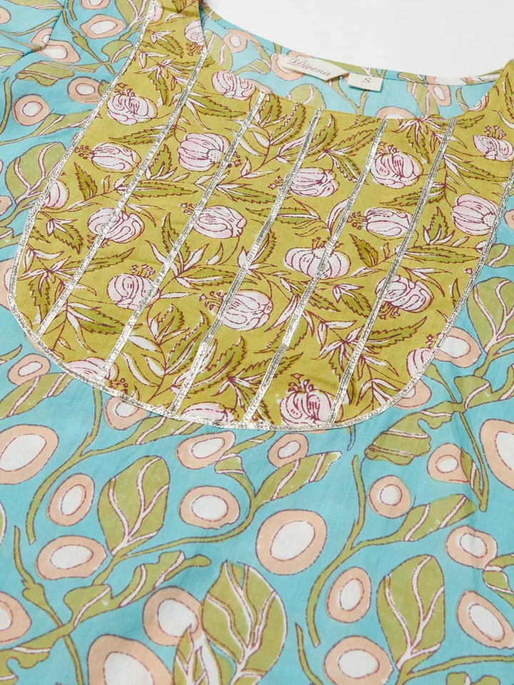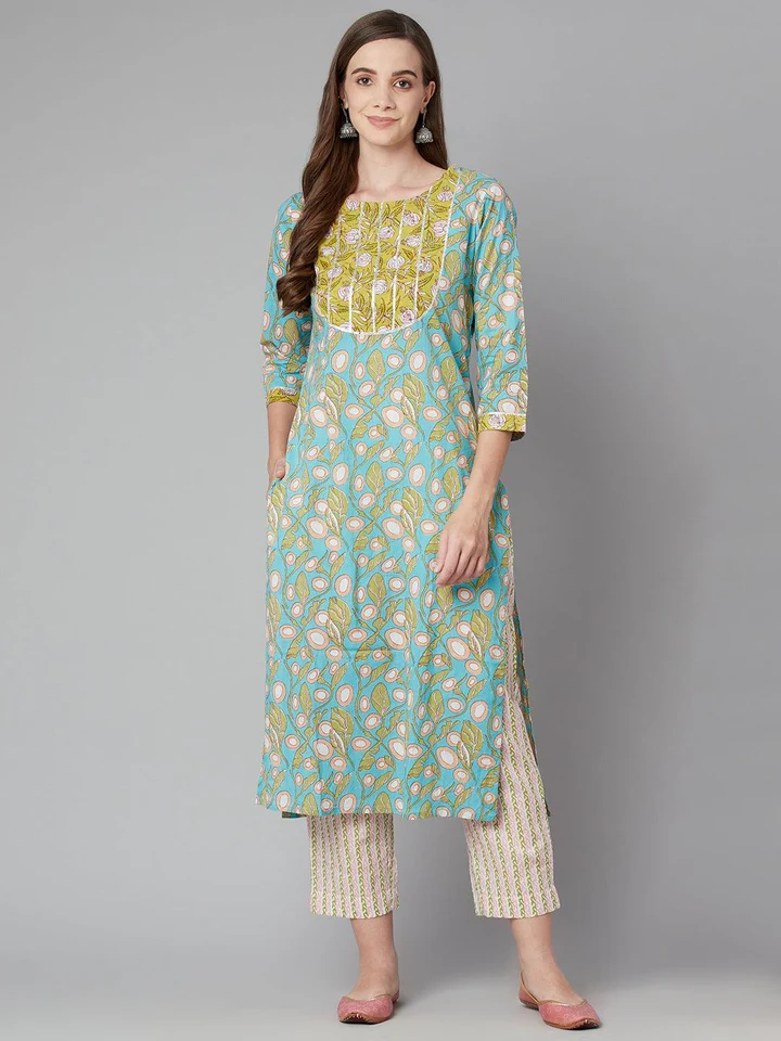 Divena Sky blue Floral Printed Cotton kurta Pant Set