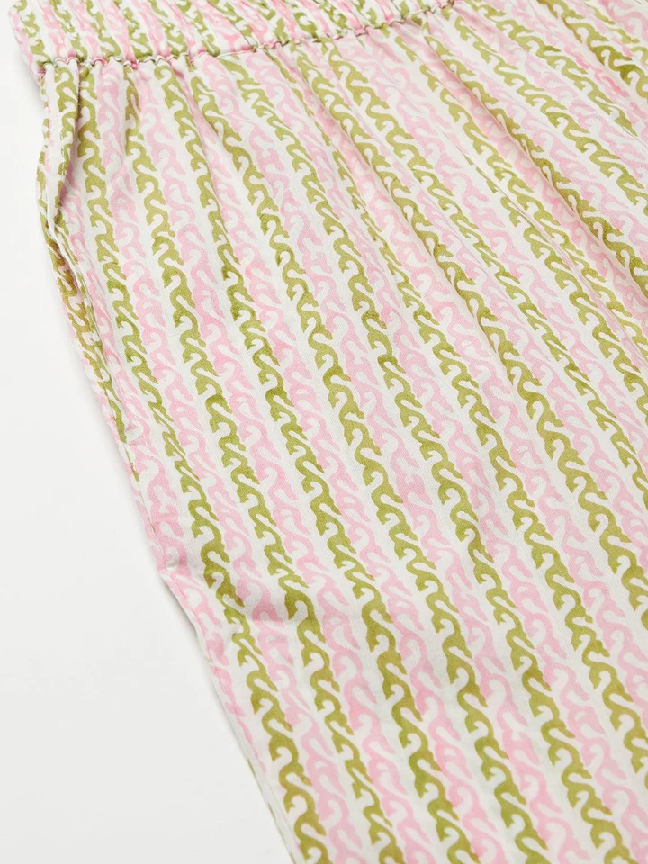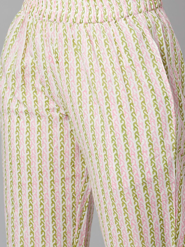 Vibrant Colors Never Fail to Make an Impression, And Our Shades of Sky Blue with Pastel green Set Is Just the Perfect One. The It Has Patch work on front Round neck with gota Patti strips along With the Printed Strips Pant with Side Pocket, Just makes it Perfect set For Any Outing.