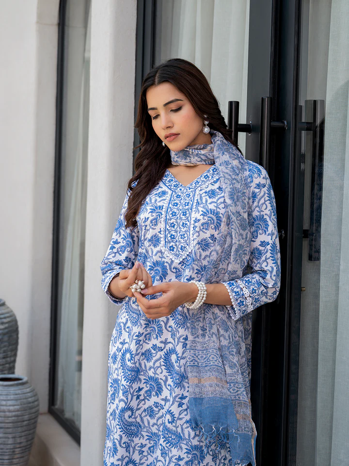 Divena Sky Blue HandBlock Floral Print Kurta Pant Dupatta Set