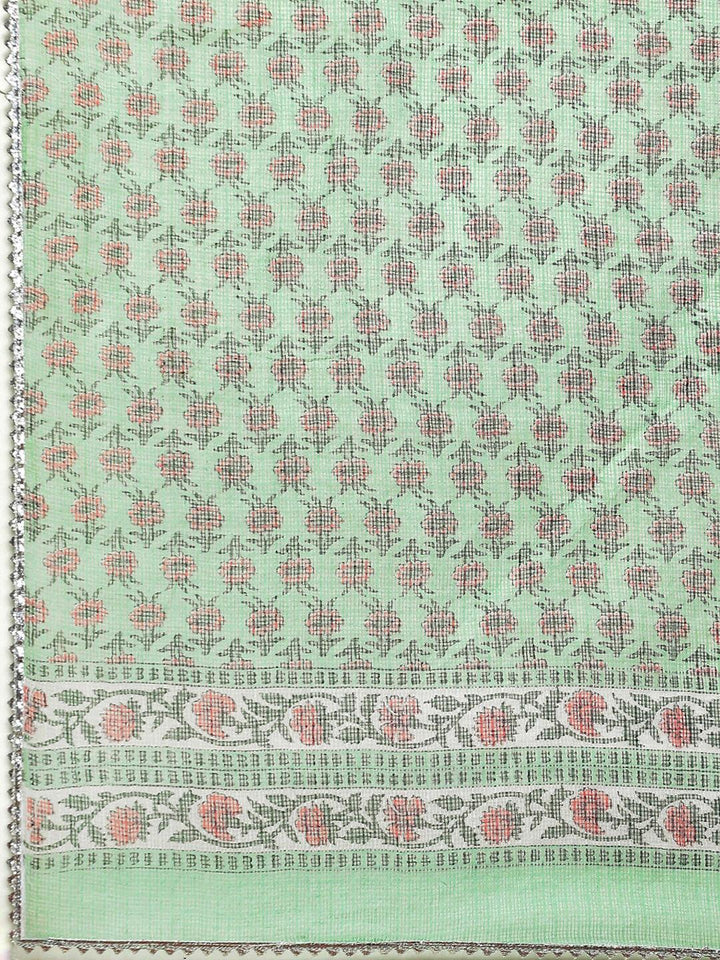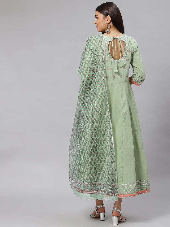 Keeping in Mind Need of Today’s World for Perfect Style, Elegance and Comfort. This Green Cotton Anarkali kurta Pant Set with Kota Doria Dupatta Set is perfect choice for you when you want to peaceful theme.it has round neck and Sliver Thread work and Gota Patti work on front neckline and bottom of this anarkali kurta with Kota Doria Dupatta gota lace Best for Ethnic look.