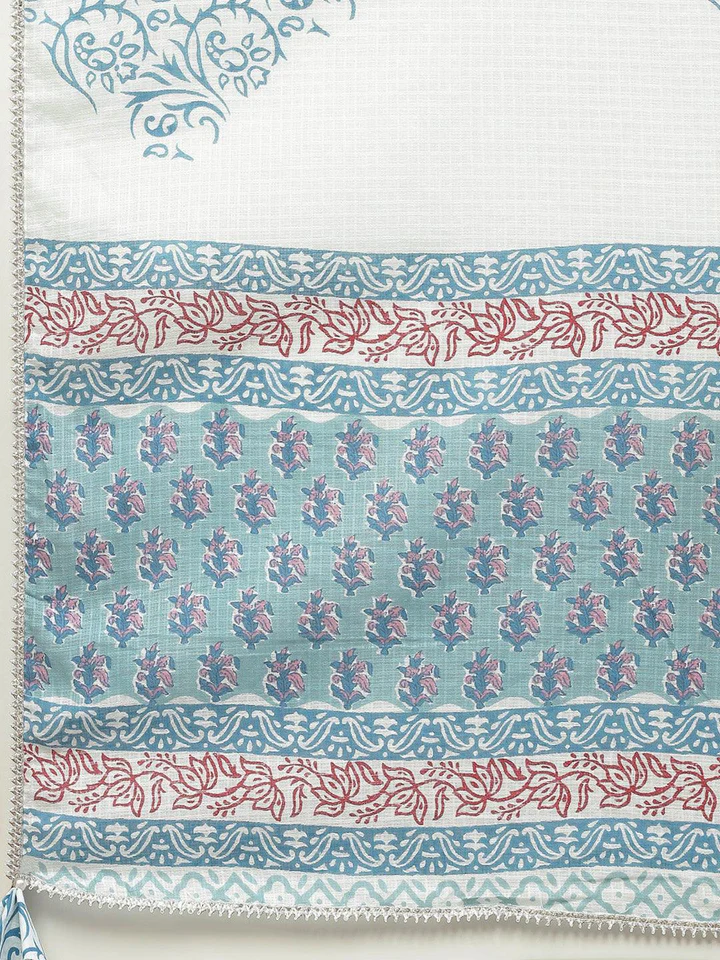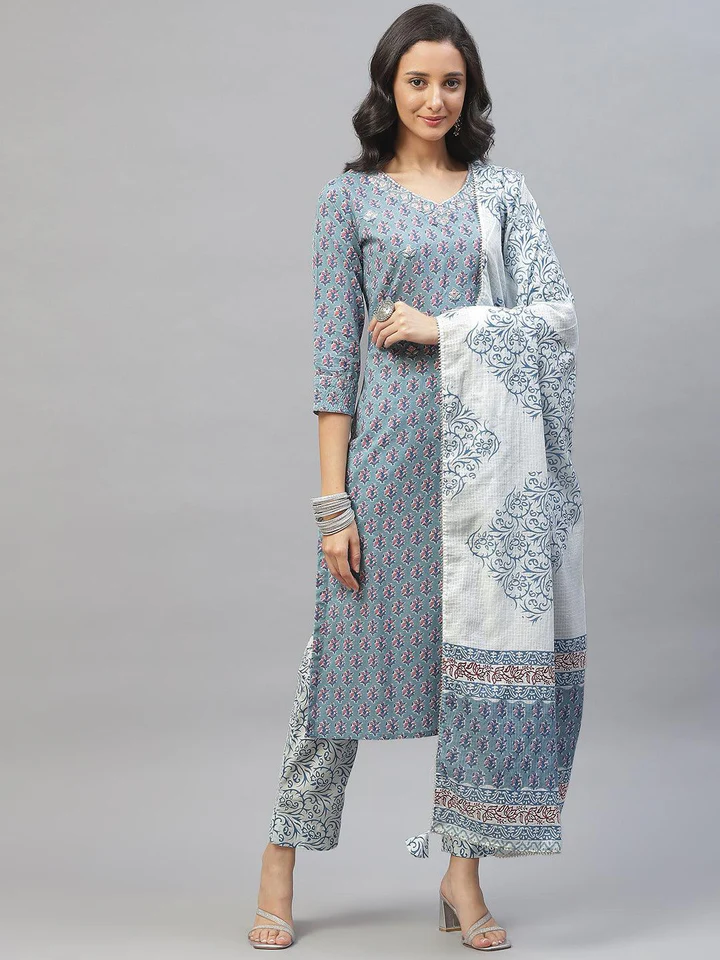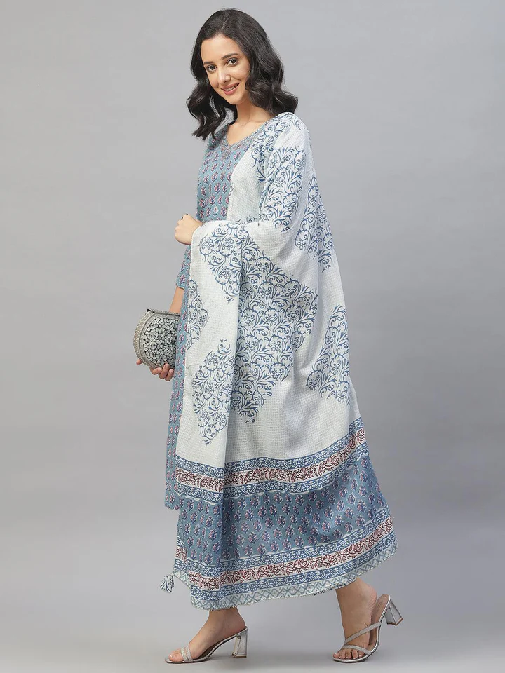 Divena Turquoise Blue Cotton Floral Printed Kurta Pant set with Dupatta