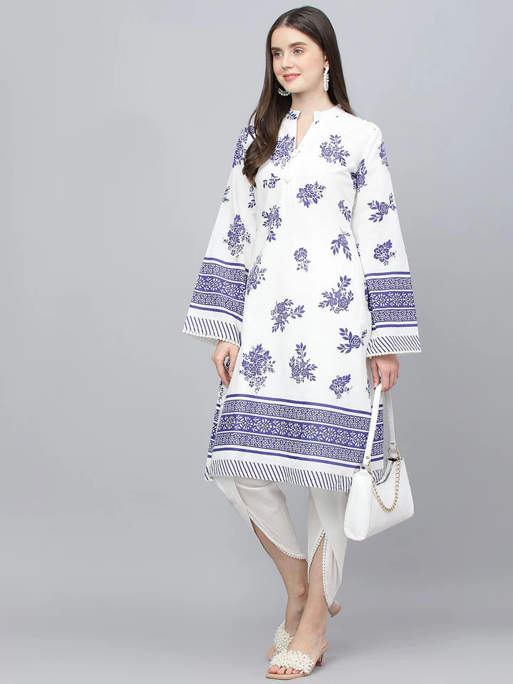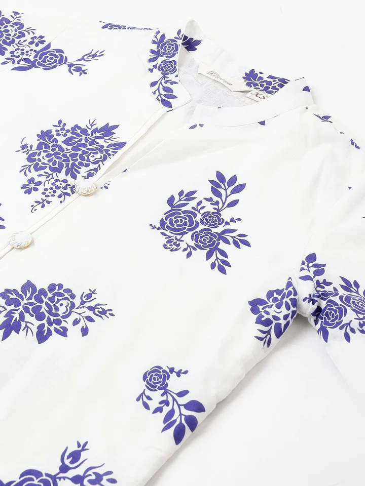 Shine Bright All Day Long with White Floral Cotton Straight Kurta Tulip Pant, It Has Floral Print All over the Kurta and Mandarin Collar. The White Solid Cotton Tulip Pant Is All Flared Up Makes It Comfortable to Wear All Day Long. Best Suited for Formal and Informal Occasion.team it with Mojari.