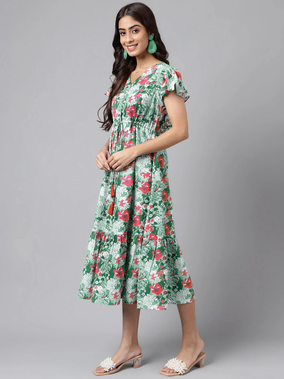 - Style:- Length: 45(inch) | Pattern: Digital Floral Printed | Occasion: Casual | Type: A-line | Sleeve Type: Short Sleeve(Flared Sleeves) | Color: Green