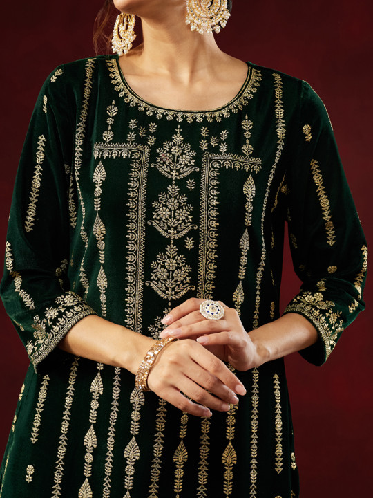 Women Ethnic Motifs Regular Velvet Kurti with Trousers & With Dupatta
