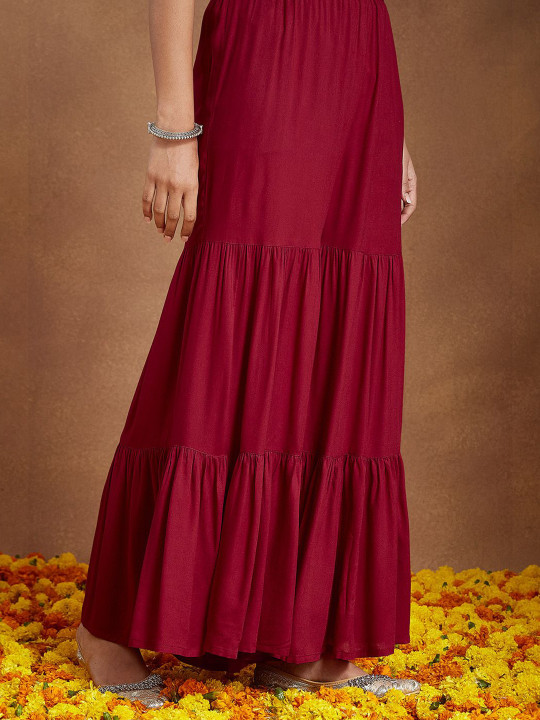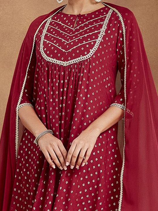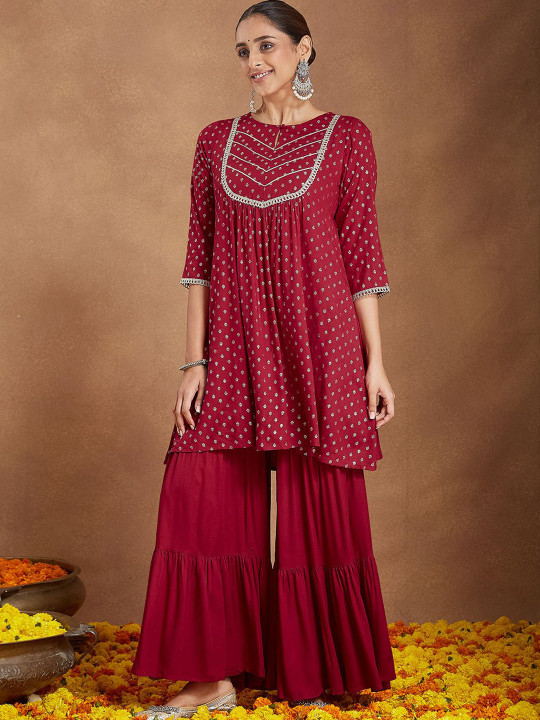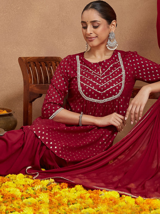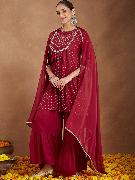 Celebrate timeless elegance with this maroon 3-piece sharara set from janasya, crafted in soft rayon for a graceful drape. The a-line kurta features a round neckline with keyhole detail, highlighted with gota patti lace on the yoke and golden lace on the patchwork border for a festive touch. All-over gold print with delicate gathers enhances the above-knee silhouette, while three-quarter sleeves with gota patti detailing add charm. Paired with a flared sharara in rayon, designed with gathers, a drawstring, and fully elasticated waist for comfort, the look is completed with a solid maroon chiffon dupatta finished with gota patti borders.
