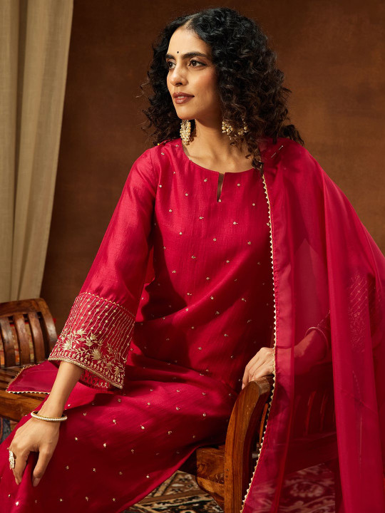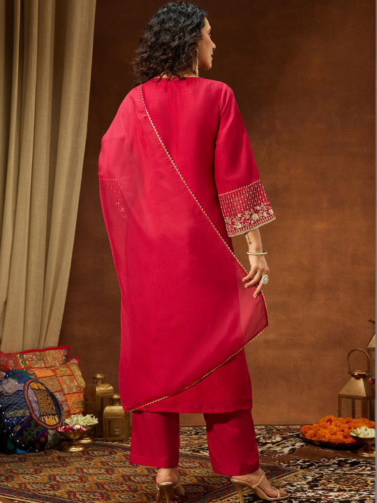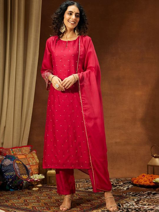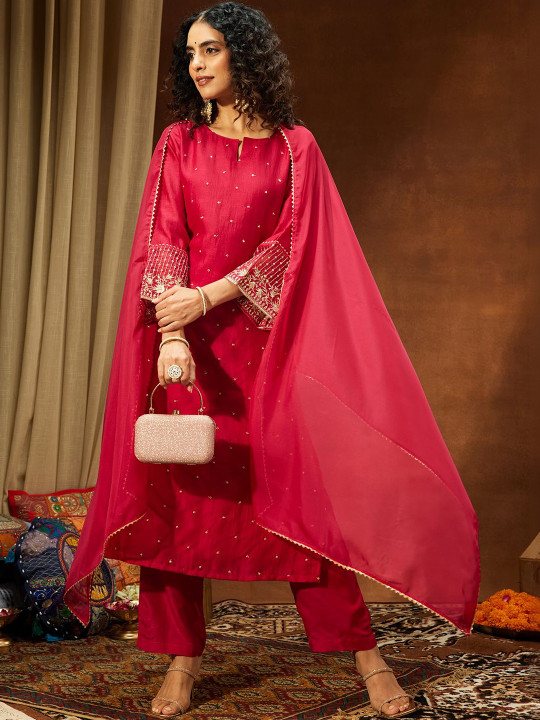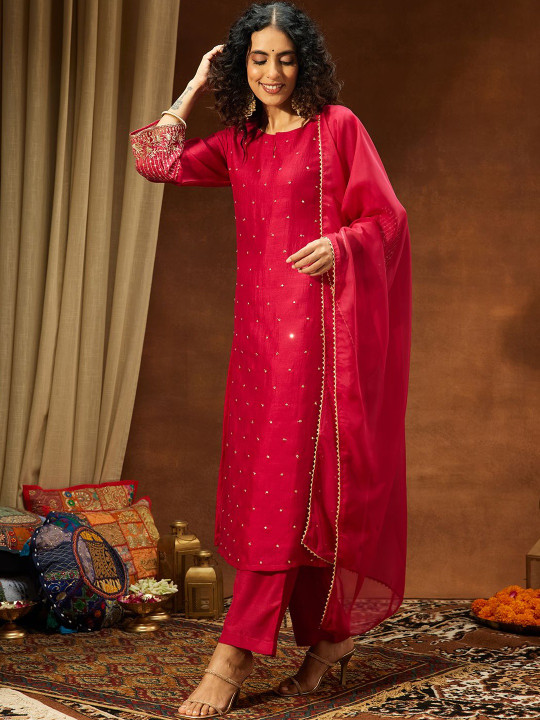 Women Floral Embroidered Regular Sequinned Kurta with Trousers & With Dupatta