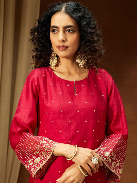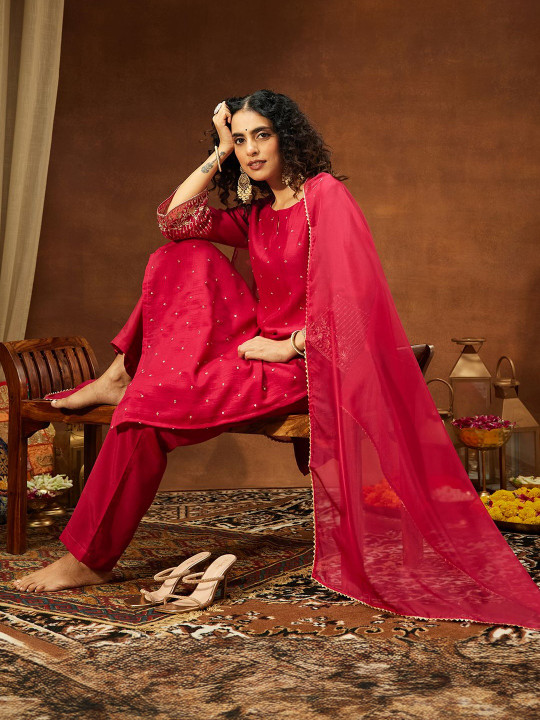 Be the first to review “Women Floral Embroidered Regular Sequinned Kurta with Trousers & With Dupatta” Cancel reply