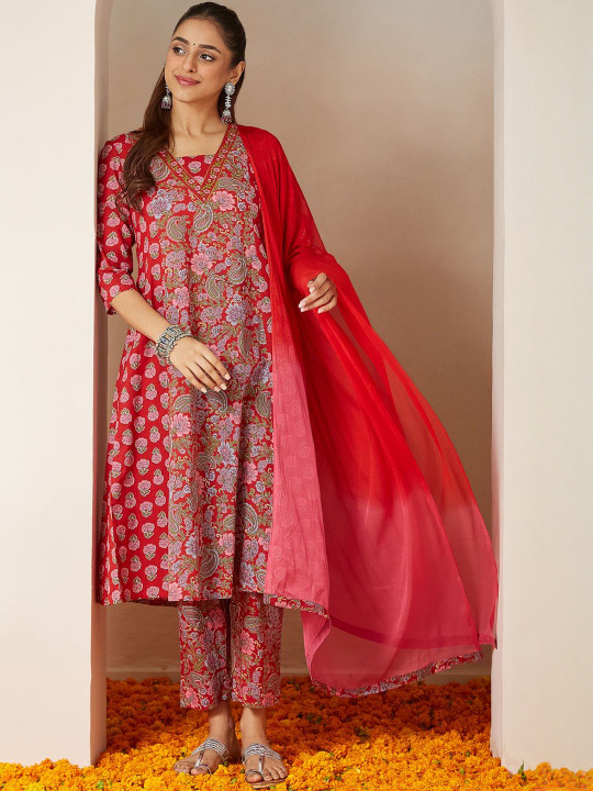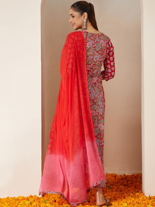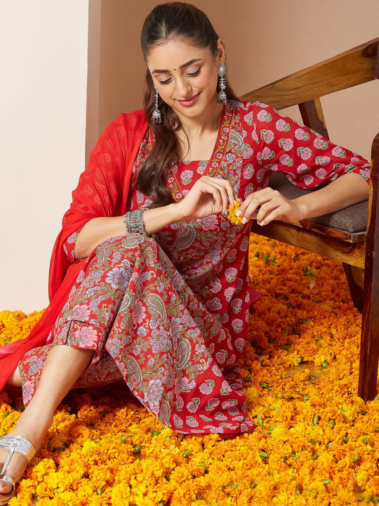 Red printed Kurti with Trousers with dupatta