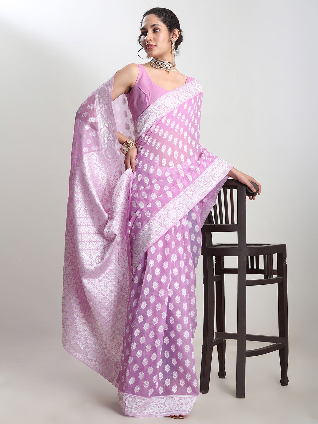 - Embrace timeless elegance with this stunning lavender silk blend jacquard saree, adorned with a beautifully woven floral pattern that radiates grace and sophistication. The rich texture and soft sheen of the fabric add a touch of luxury, making it a perfect choice for festive occasions, weddings, and celebrations. Paired with a matching blouse for a seamless and refined look, this saree drapes effortlessly, ensuring both comfort and style. Complete your ensemble with statement jewellery to enhance its charm.